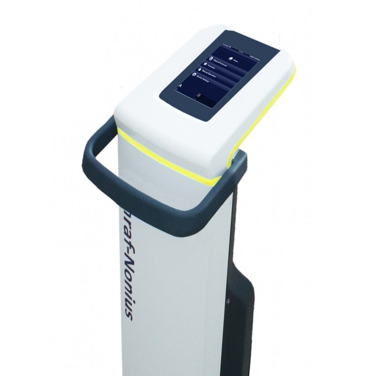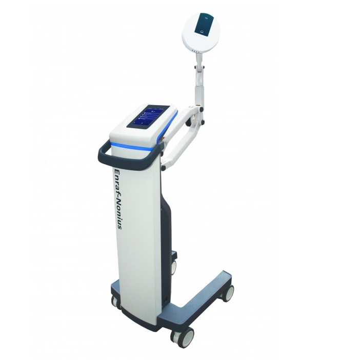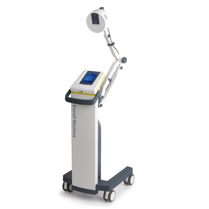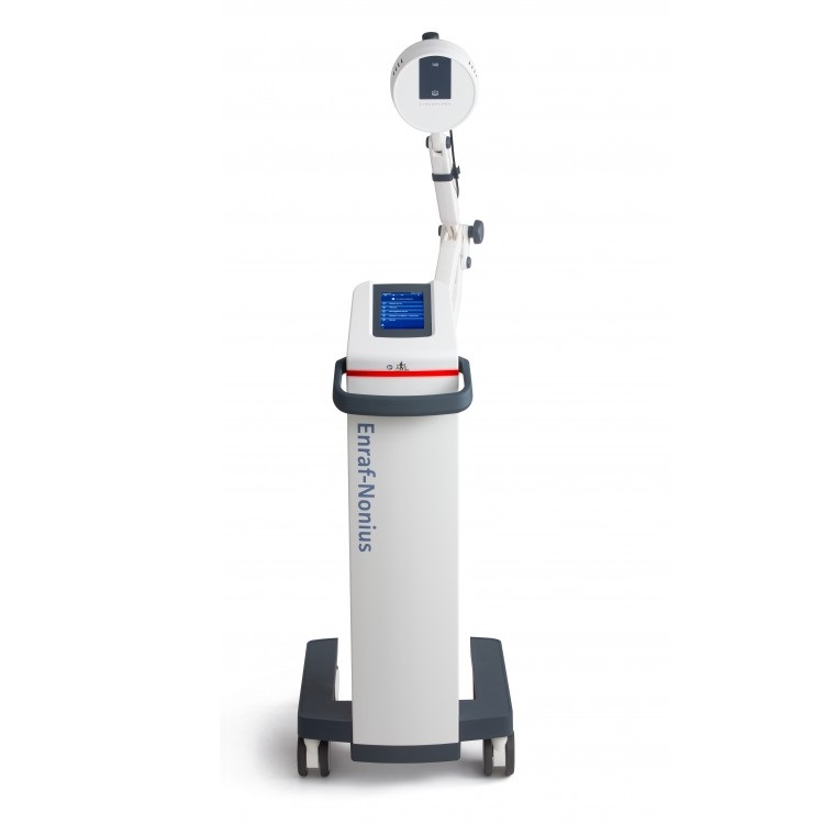 Diatermia krótkofalowa Curapuls 670 Enraf-Nonius. Wysokiej jakości urządzenie, typu "terapuls". Aparat wytwarza energię elektromagnetyczną z częstotliwością 27.12 MHz ± 0.16 MHz. Ze względu na impulsowy charakter pola elektromagnetycznego, wysoka moc szczytowa może być wytwarzana w bardzo krótkim czasie z występującym następnie długim okresem odpoczynku. Powoduje to bardzo intensywną stymulację tkanek. Curapuls 670 posiada dwa kanały, do których równocześnie można podłączyć dwie elektrody. Istnieje możliwość ustawienia niezależnych parametrów dla dwóch kanałów.