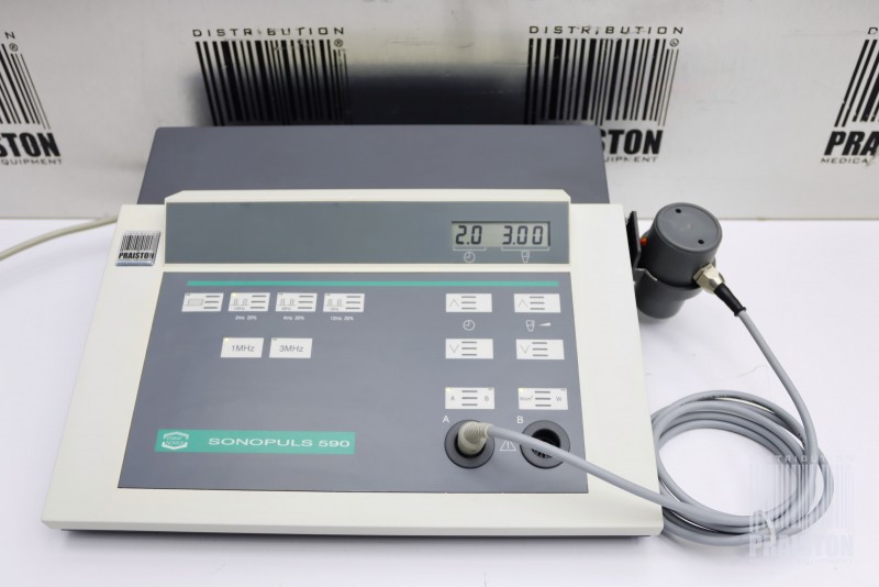 Używany, stan techniczny bardzo dobry, Produkcji holenderskiej, Zasilanie: 230 V Częstotliwość: 50/60 Hz, Sonopuls 590 to sterowany mikroprocesorowo aparat do ciągłej i pulsacyjnej terapii ultradźwiękowej, Umożliwia współpracę z emiterami pracującymi na częstotliwościach 1 i 3 MHz, Zaprojektowany do wielogodzinnej ciągłej pracy w szpitalu, przychodni, Specyfikacja: Intensywność impulsu: 0-3 W / cm2, Tryby impulsowe: 16, 48, 100 Hz, Posiada: Pulsacyjny i ciągły tryb pracy, Czujnik kontaktowy, Wyświetlacz, Timer do wyłączania, Wskazania: Stany wpływające na tkankę kostną, stawy, tkankę mięśniową, Reumatoidalne zapalenie stawów (nieostre), Choroby nerwów obwodowych, Zaburzenia krążenia krwi, Choroby narządów wewnętrznych, Zmiany skórne, blizny, Przykurcz Dupuytrena, Otwarte rany, odleżyny, stany pourazowe, W zestawie: Głowica zabiegowa Enraf Nonius 1 MHz, Uchwyt do głowicy, Przewód zasilający, Wymiary: 36,2 x 13,5 x 33 cm, Waga kompletu: 7 kg, Posiada wystawiony aktualny Paszport Techniczny, Gwarancja: 6 miesięcy na rynek krajowy - Polska, 1 miesiąc na rynek międzynarodowy, Możliwość finansowania (tylko Polska): Raty, Leasing, Pożyczka,