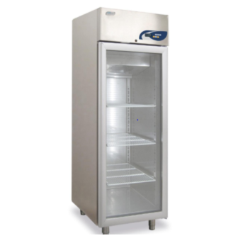 Szklane drzwiczki: na zawiasach, aluminiowa ramka wokół szyby oraz trzy warstwy szkła hartowanego z próżnią pomiędzy warstwami w celu zwiększenia izolacji. Drzwi są wyposażone w gumową, magnetyczną uszczelkę aby zapewnić idealne hermetyczne zamknięcie. Uchwyt wykonany jest z aluminium, zintegrowanego z profilem drzwi na całej wysokości dla większego komfortu użytkowania. Drzwi są również wyposażone w urządzenie automatycznie zamykające chłodziarkę, jeśli drzwi są otwarte pod kątem mniejszym niż 90 °, oraz dyszę zatrzymującą wewnętrzną wentylację (aby ograniczyć straty temperatury wewnętrznej)