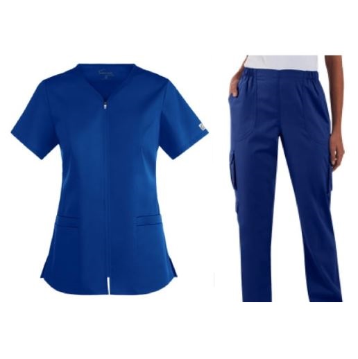 Karry to komplet damski, w którego skład wchodzi niebieska bluza z dekoracyjnym zamkiem przy dekolcie, posiadająca dwie podwójne kieszenie, do których można schować niezbędne akcesoria. Do tego dochodzą spodnie wykonane na krój jeansów, w tym samym kolorze, wyposażone w dwie praktyczne kieszenie. Bluza i spodnie wykonane zostały z wysokiej jakości materiałów, jakimi są - bawełna 50% i poliester 50%. Komplet nie ulega zniszczeniom ani odbarwieniom po praniu oraz jest łatwy do utrzymania w czystości. Jest niezwykle komfortowy w noszeniu, daje pełną swobodę przy wykonywaniu ruchów, a więc w pracy sprawdzi się idealnie. Stworzony z myślą o długiej pracy, nada się dla lekarzy, kosmetologów, pracowników SPA czy personelu medycznego. Dostępny jest w wielu rozmiarach, dzięki czemu dla każdego znajdzie się odpowiedni model spełniający wszelkie oczekiwania.