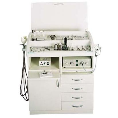 Unit laryngologiczny Everest-T2 z ssakiem i sprężarką, pojedyncza szafka, z biurkiem z pokrywą, z tacami na instrumenty; 2 silniki.