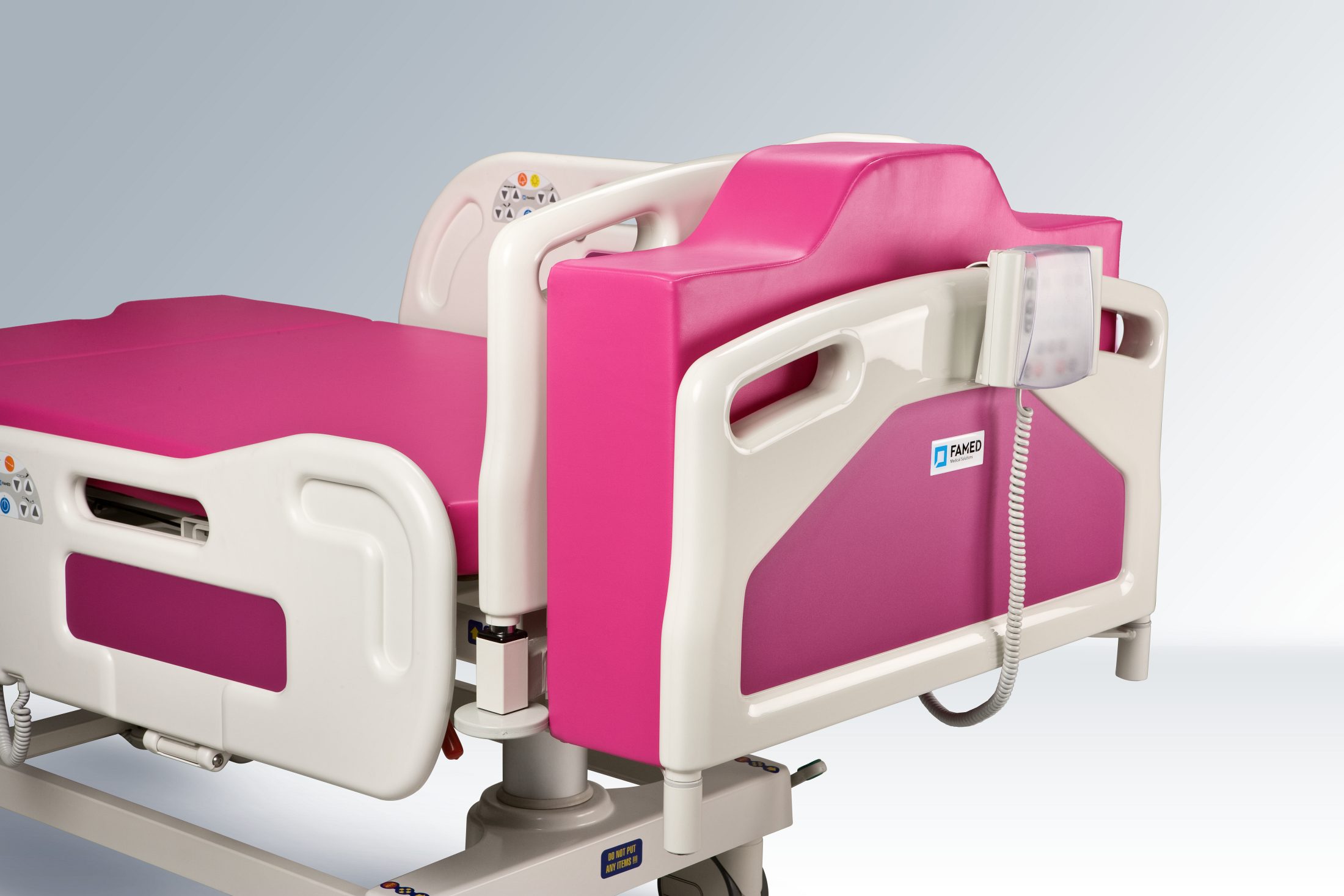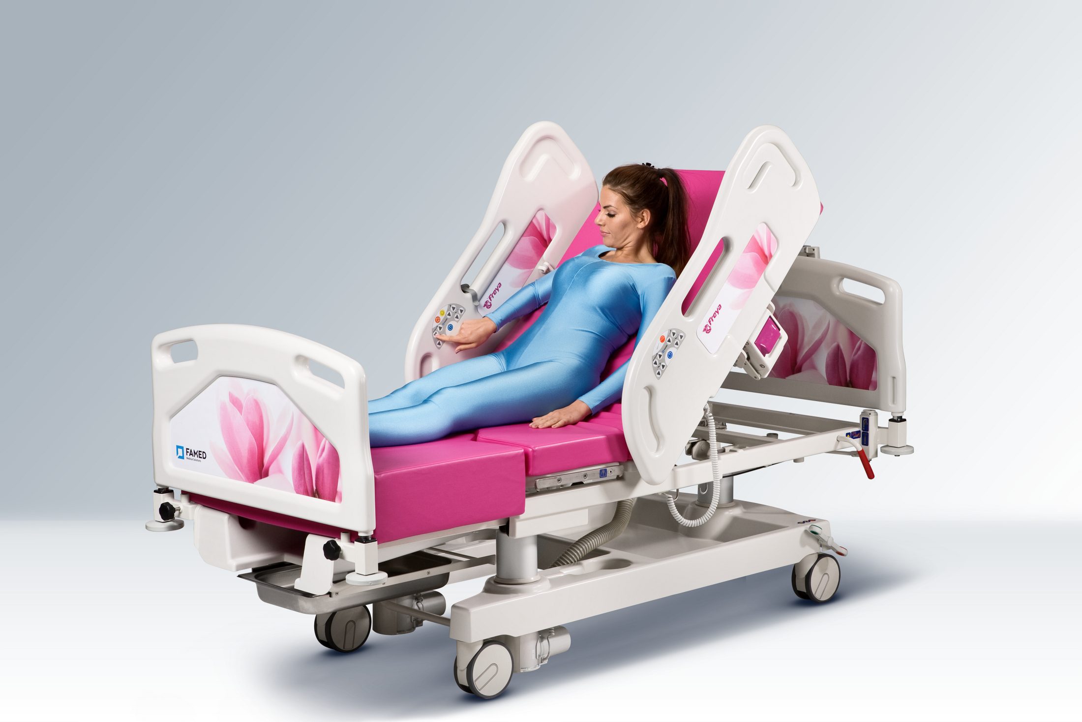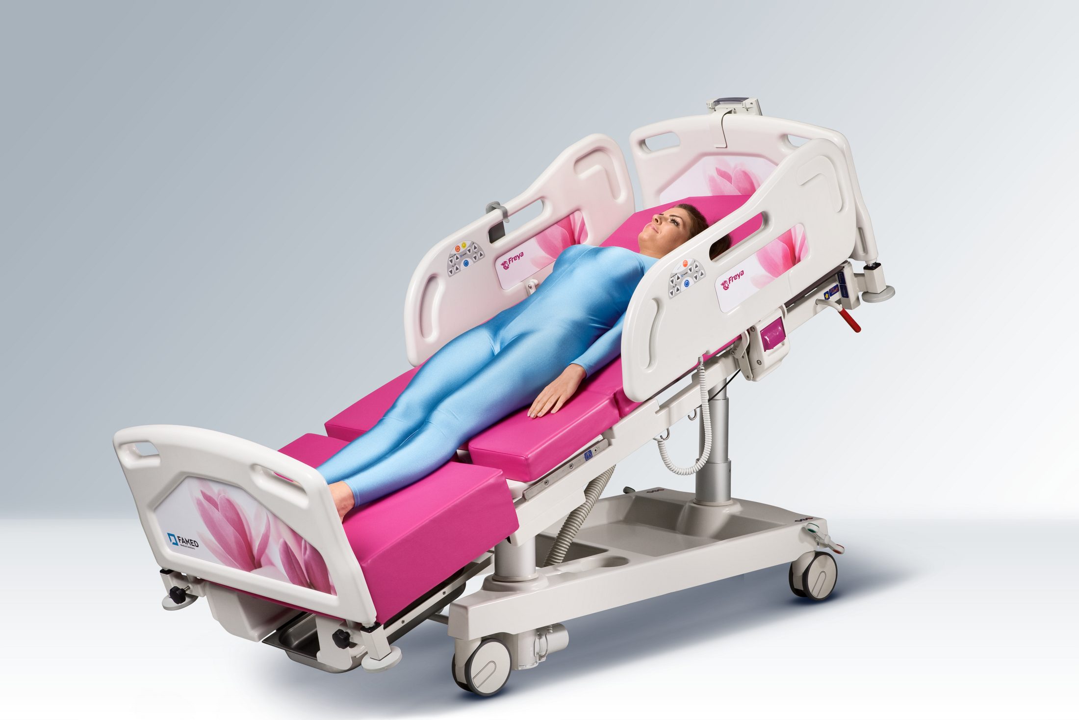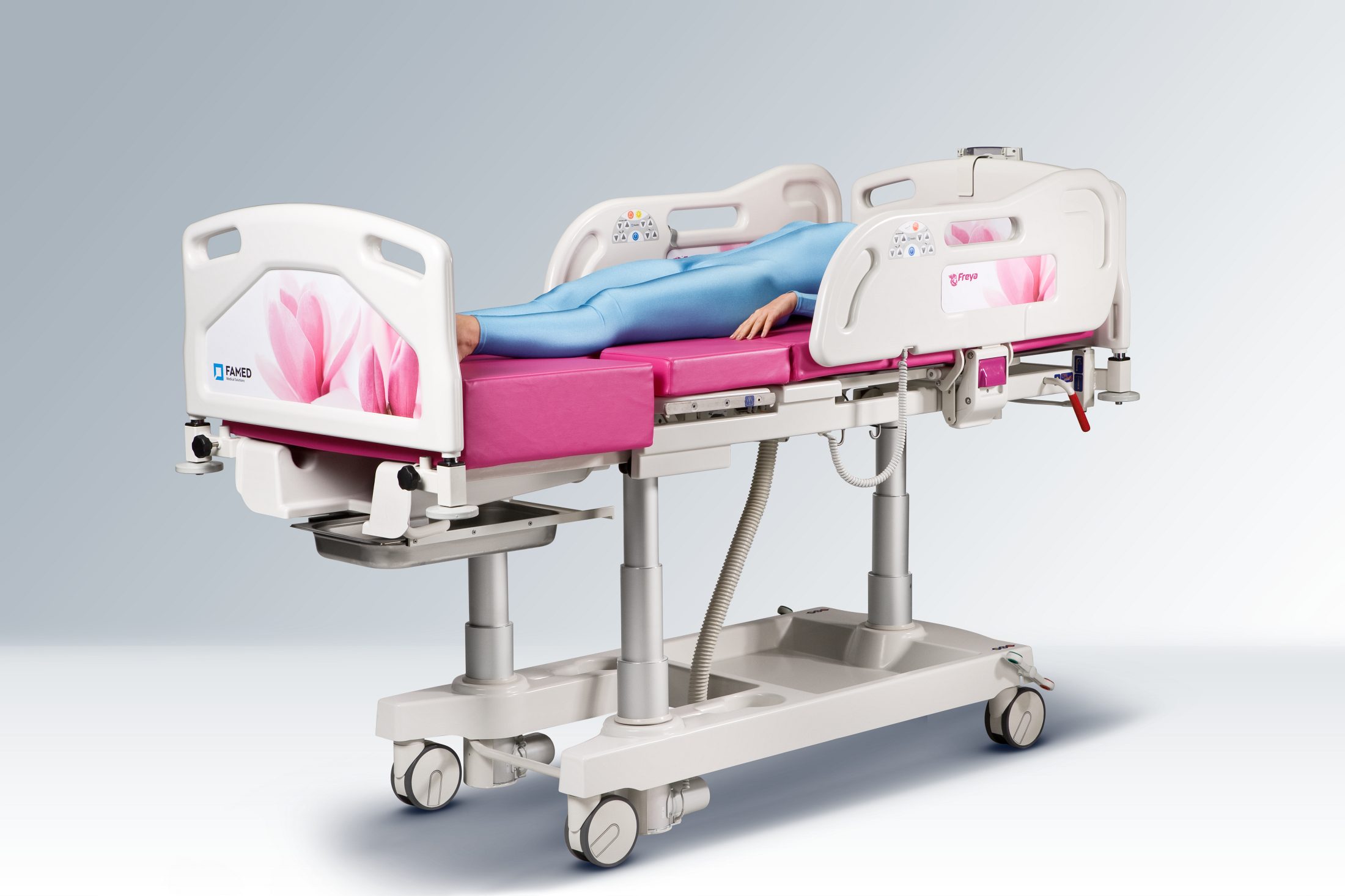 Famed Freya to łóżko o stabilnej, kolumnowej konstrukcji. Pozwoli przybrać dowolne pozycje porodowe. Barierki opuścić można poniżej poziomu leża, ułatwia to zejście z łóżka. Części tworzywowe wykonano z materiałów o właściwościach antydrobnoustrojowych w technologii pSilver™, materace zaś z tkanin antybakteryjnych, z klejonymi szwami. Wszystkie akcesoria mocowane są w pewny i stabilny sposób, zapewniając dobre podparcie podczas akcji porodowej.