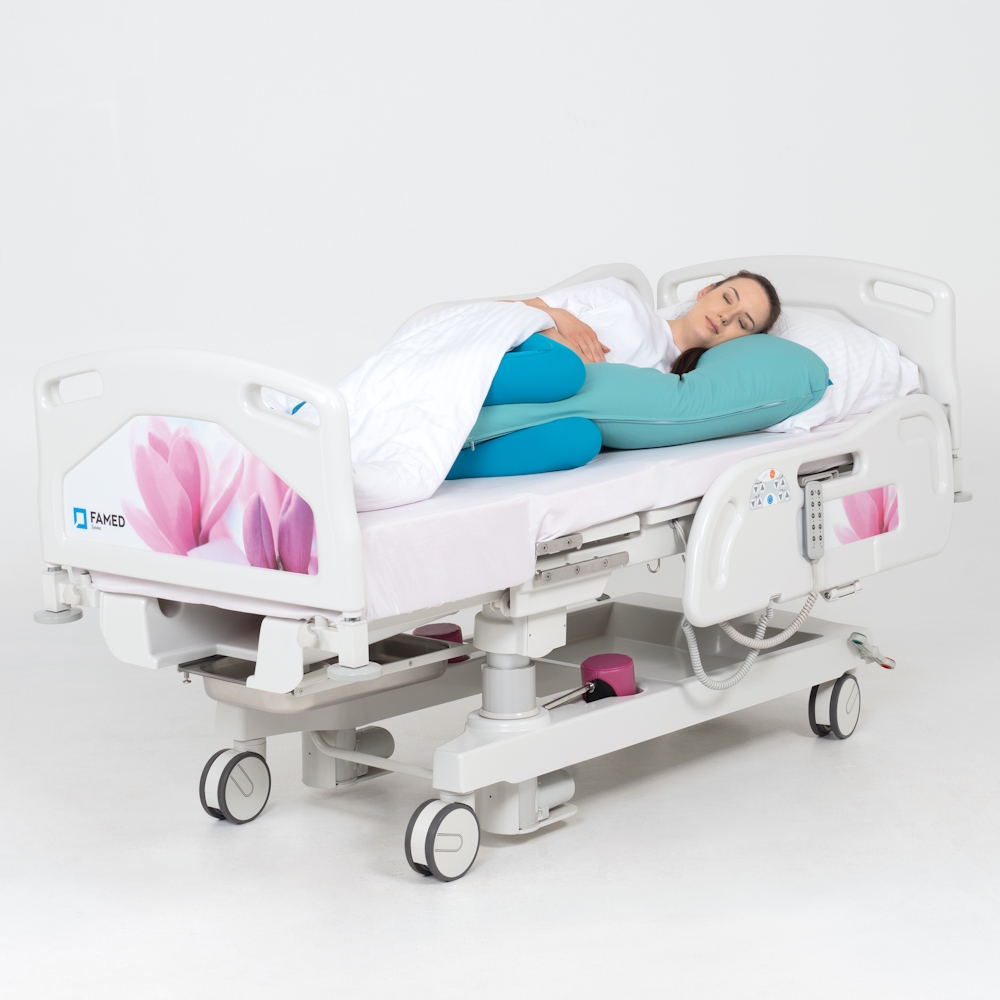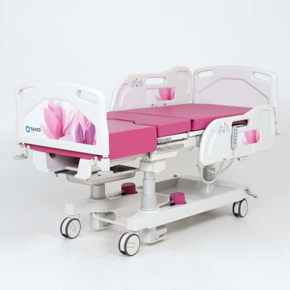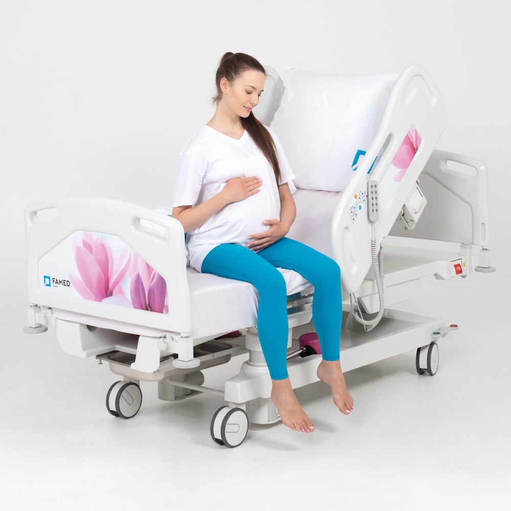 Famed FREYA może szybko przeobrazić się z łóżka szpitalnego w łóżko porodowe, spełnia jednocześnie normę PN-EN 60601-2-52 oraz posiada wygodne, opuszczane poręcze boczne. W podstawie łóżka znajdują się miejsca na odłożenie nieużywanych akcesoriów, a wszystkie przewody i elementy sterujące są osłonięte lub schowane, aby ułatwić czyszczenie i dezynfekcję. Famed FREYA jest łóżkiem w pełni sterowanym elektrycznie.