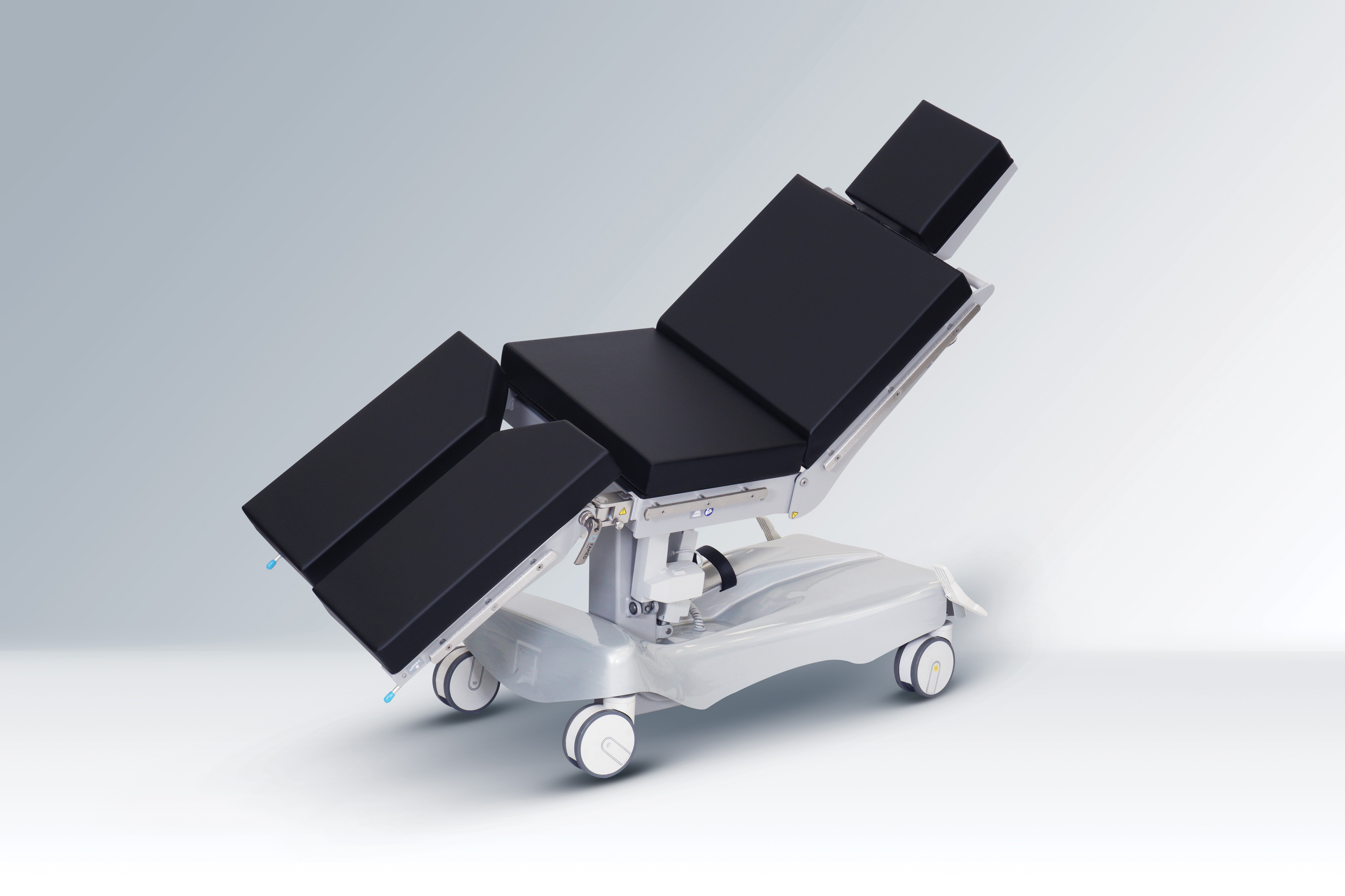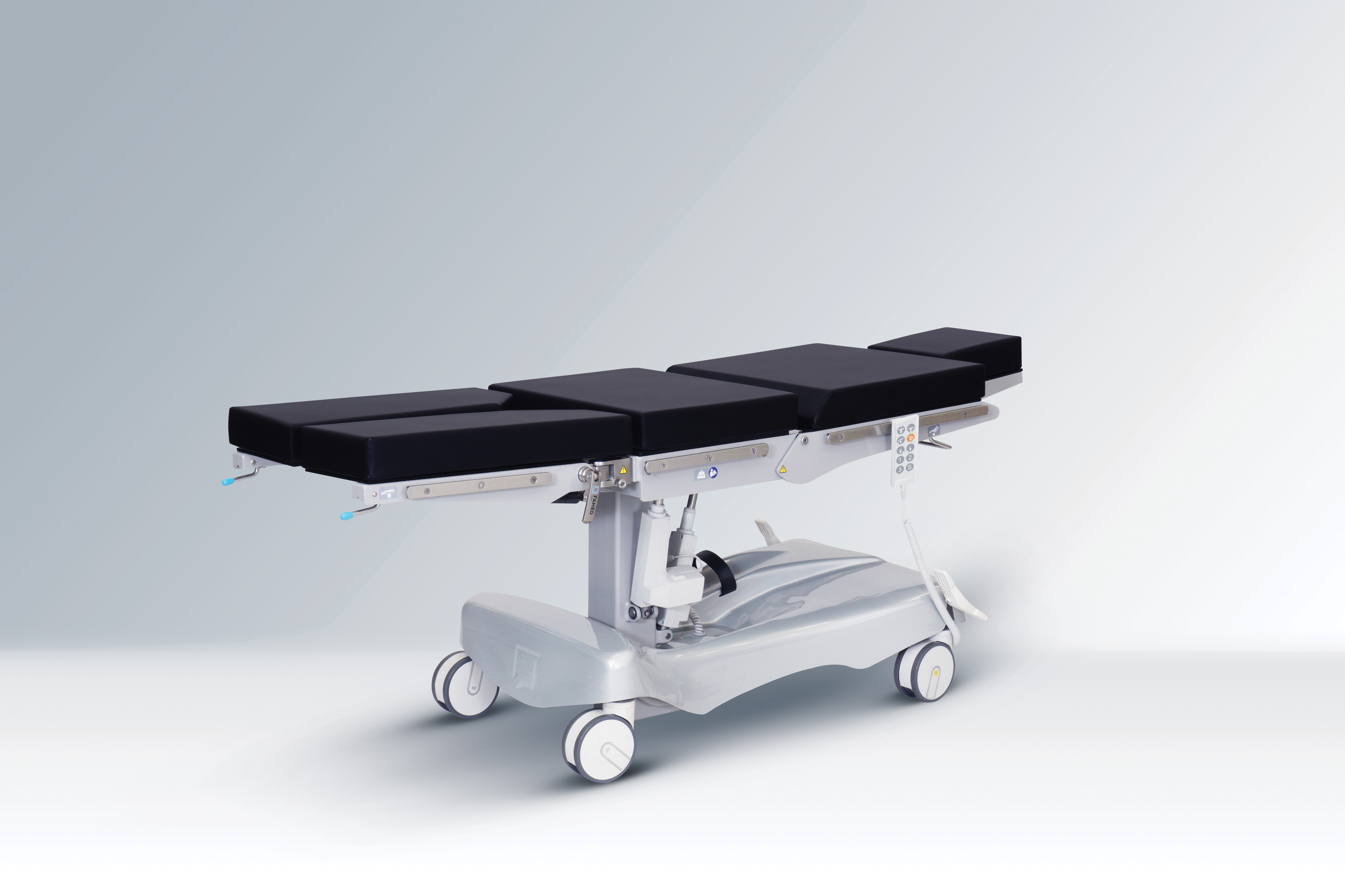 Pilotem możemy wykonać regulację: wysokości blatu, przechyłów bocznych, Trendelenburga i anty-Trendelenburga. Układ sterowania umożliwia zaprogramowanie w pilocie bbSafe™ trzech predefiniowanych ustawień stołu i blatu (np. blat w poziomie).