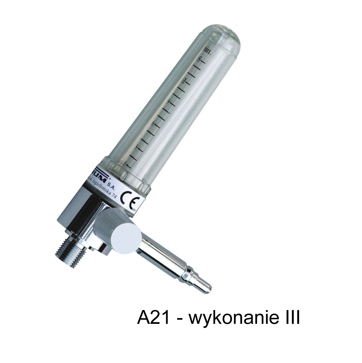 Dozownik do tlenu z przepływomierzem do gniazd ściennych przystosowany do jednorazowych nawilżaczy bąbelkujących i jednorazowych pojemników z wodą destylowaną.