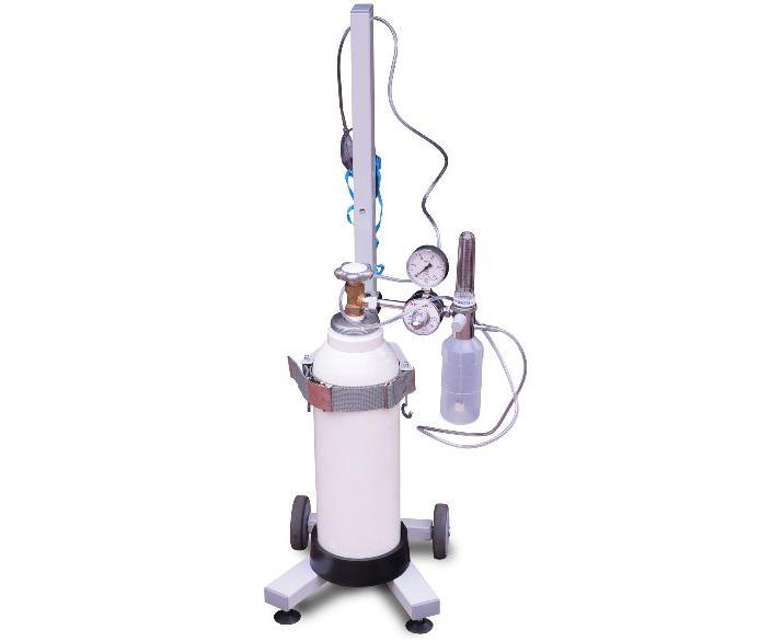 Wózek do transportu wewnętrznego butli ze sprężonym tlenem medycznym o pojemności 5 lub 10 litrów oraz jako statyw zabezpieczający butlę przed przewróceniem. Dane techniczne: wysokość wózka: 1020 mm, rozstaw osi kół: 245 mm, maksymalne obciążenie wózka: 40 kg, dopuszczalna wielkość transportowanych butli: 5 lub 10 litrów, ciężar wózka: 6,5 kg. - wózek pokryty jest lakierem proszkowym, który nadaje mu estetyczny wygląd, - stalowa obejma i mały rozstaw osi kół umożliwiają bezpieczne i łatwe manewrowanie wózkiem nawet na małych powierzchniach, - dzięki zastosowaniu dużych kół jezdnych wózek może pokonywać przeszkody takie jak: progi mieszkalne i inne, - stopki pozwalają wypoziomować wózek i zapobiegają jego przesuwaniu się, - gumowa podstawa pod butlę amortyzuje wstrząsy powstające podczas eksploatacji wózka a jej kształt ułatwia pozycjonowanie butli, - zestaw pasków z zaciskiem gwarantują łatwy montaż butli oraz zabezpieczają przed samowypadnięciem butli z wózka, - para wieszaków (5) zamocowanych na obejmie butli służy do zawieszania elementów dodatkowych przydatnych przy eksploatacji butli takich jak: maska tlenowa, przewody itd.