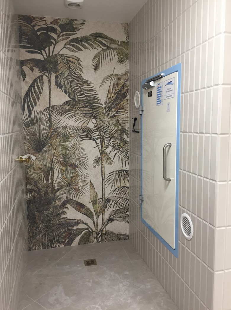 Podświetlany, pływający głośnik z funkcją Bluetooth pozwala odtwarzać ulubioną muzykę lub nagrania relaksacyjne, budując indywidualne doświadczenie dla każdego użytkownika. Zewnętrzna zabudowa może być wykończona materiałami premium, takimi jak egzotyczne drewno, kamień czy szkło, dzięki czemu kabina staje się eleganckim, luksusowym akcentem w każdym obiekcie.