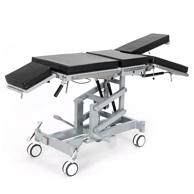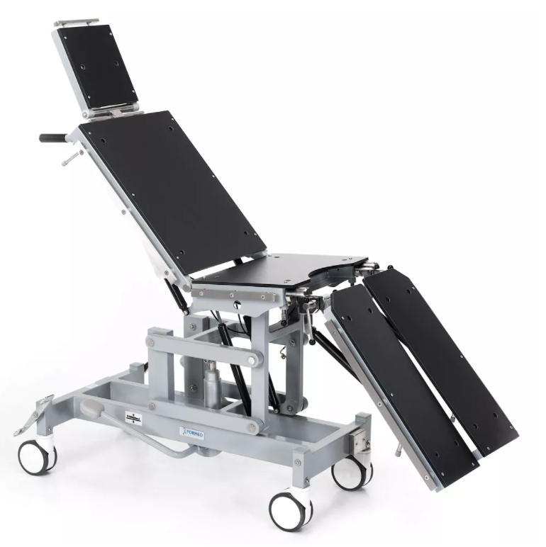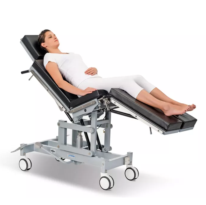 - Funkcje jak w stole operacyjnym: regulacja wysokości, przechyły wzdłużne, ustawienia segmentów blatu. Czterosegmentowy blat pozwala na ułożenie pacjenta w pozycji siedzącej, leżącej, półleżącej a także w pozycji flex i reflex.