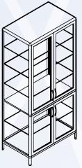 Szafa dwudrzwiowa przeszklona dzielona szafa w górnej części z trzema półkami szklanymi, drzwi szklane, w dolnej części jedna półka szklana, drzwi szklane, boki szklane. Konstrukcja mebli: profile aluminiowe i złączki tworzące trwałą i estetyczną konstrukcję mebli; profile aluminiowe anodowane o przekroju 25x25mm, w kolorze srebrnym; złączki wykonane z tworzywa ABS wzmocnione wewnątrz zatopionym elementem metalowym o dużej odporności mechanicznej; wypełnienie z płyty melaminowej; fronty szuflad i drzwi wykonane z płyty melaminowej, krawędzie zabezpieczone obrzeżem PVC w kolorze identycznym z kolorem korpusu o grubości 2 mm; półki w szafach zamkniętych pełnym frontem wykonane z płyty melaminowej, wszystkie krawędzie zabezpieczone obrzeżem PVC; półki w szafach o bokach i frontach oszklonych wykonane ze szkła, wszystkie krawędzie szlifowane; fronty szklane wykonane ze szkła bezpiecznego przeźroczystego o grubości 5 mm; blaty robocze wykonane z płyty wiórowej laminowanej laminatem wysokociśnieniowym odpornym na środki dezynfekujące, grubość blatu 28 mm, krawędzie zabezpieczone obrzeżem PVC; dla pomieszczeń socjalnych odporność termiczna blatów roboczych na temperaturę 200o C; szafki stacjonarne posiadają nóżki o wysokości 120 mm z regulacją wysokości; kolorystyka wg. wytycznych klienta.
