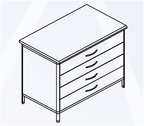 Szafka z szufladami z czterema.szufladamiSzafka z systemu ALUFORM. Konstrukcja mebli: profile aluminiowe i złączki tworzące trwałą i estetyczną konstrukcję mebli; profile aluminiowe anodowane o przekroju 25x25mm, w kolorze srebrnym; złączki wykonane z tworzywa ABS wzmocnione wewnątrz zatopionym elementem metalowym o dużej odporności mechanicznej; wypełnienie z płyty melaminowej; fronty szuflad i drzwi wykonane z płyty melaminowej, krawędzie zabezpieczone obrzeżem PVC w kolorze identycznym z kolorem korpusu o grubości 2 mm; półki w szafach zamkniętych pełnym frontem wykonane z płyty melaminowej, wszystkie krawędzie zabezpieczone obrzeżem PVC; półki w szafach o bokach i frontach oszklonych wykonane ze szkła, wszystkie krawędzie szlifowane; fronty szklane wykonane ze szkła bezpiecznego przeźroczystego o grubości 5 mm; blaty robocze wykonane z płyty wiórowej laminowanej laminatem wysokociśnieniowym odpornym na środki dezynfekujące, grubość blatu 28 mm, krawędzie zabezpieczone obrzeżem PVC; dla pomieszczeń socjalnych odporność termiczna blatów roboczych na temperaturę 200o C; szafki stacjonarne posiadają nóżki o wysokości 120 mm z regulacją wysokości; kolorystyka wg. wytycznych klienta.