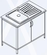 Szafka ze zlewem jednokomorowym z ociekaczem. Szafka z systemu ALUFORM. Konstrukcja mebli: profile aluminiowe i złączki tworzące trwałą i estetyczną konstrukcję mebli; profile aluminiowe anodowane o przekroju 25x25mm, w kolorze srebrnym; złączki wykonane z tworzywa ABS wzmocnione wewnątrz zatopionym elementem metalowym o dużej odporności mechanicznej; wypełnienie z płyty melaminowej; fronty szuflad i drzwi wykonane z płyty melaminowej, krawędzie zabezpieczone obrzeżem PVC w kolorze identycznym z kolorem korpusu o grubości 2 mm; półki w szafach zamkniętych pełnym frontem wykonane z płyty melaminowej, wszystkie krawędzie zabezpieczone obrzeżem PVC; półki w szafach o bokach i frontach oszklonych wykonane ze szkła, wszystkie krawędzie szlifowane; fronty szklane wykonane ze szkła bezpiecznego przeźroczystego o grubości 5 mm; blaty robocze wykonane z płyty wiórowej laminowanej laminatem wysokociśnieniowym odpornym na środki dezynfekujące, grubość blatu 28 mm, krawędzie zabezpieczone obrzeżem PVC; dla pomieszczeń socjalnych odporność termiczna blatów roboczych na temperaturę 200o C; szafki stacjonarne posiadają nóżki o wysokości 120 mm z regulacją wysokości; kolorystyka wg. wytycznych klienta.