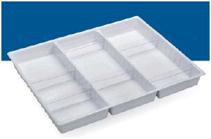 Plastikowe organizery z reulowanymi podziałkami do szuflad o wysokośći 75, 155, 235 mm.