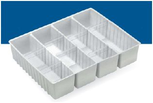 Plastikowe organizery z reulowanymi podziałkami do szuflad o wysokośći 155, 235 mm.
