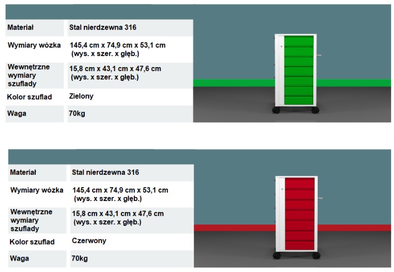 Nasze wózki transportowe mogą być używane zarówno do krótkotrwałego przechowywania, jak i do transportu endoskopów. Charakteryzują się różnymi kolorami: