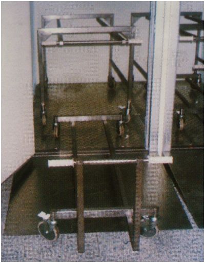 Zestaw wózków do trumien o dwóch poziomach.