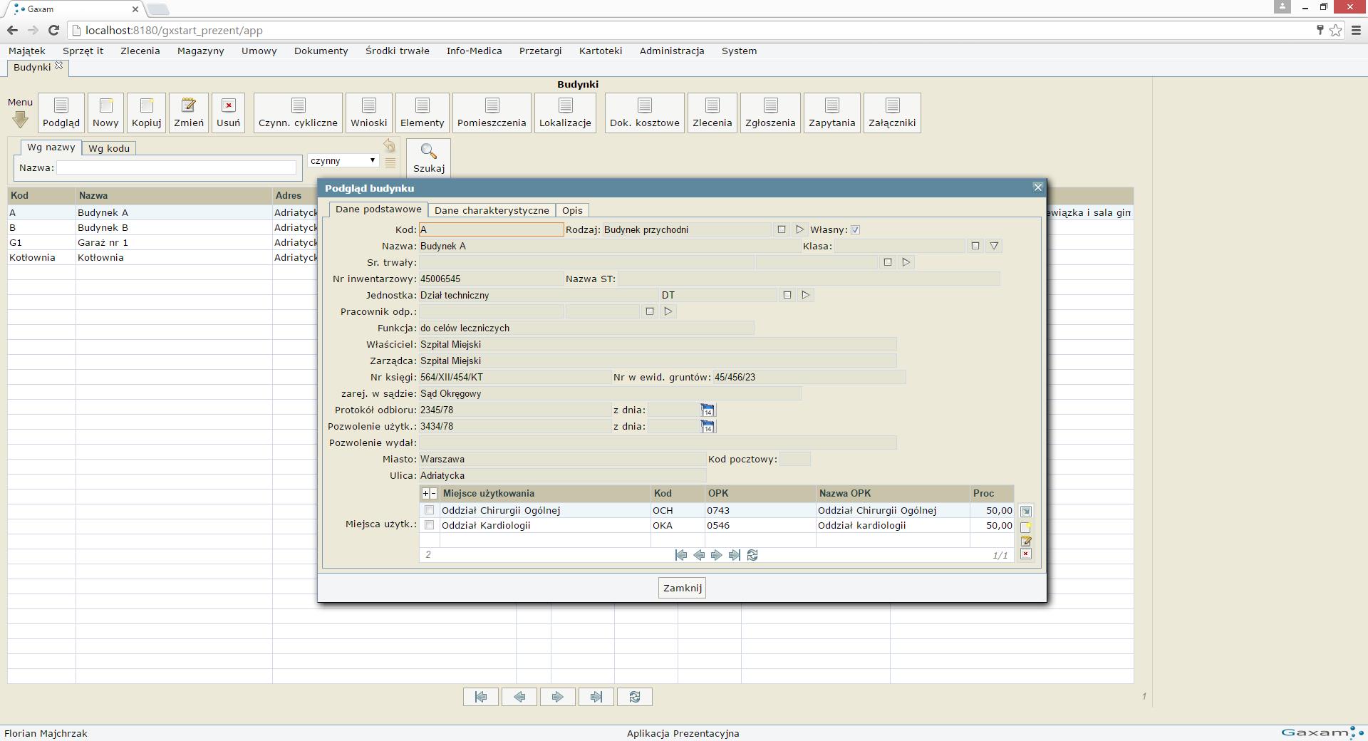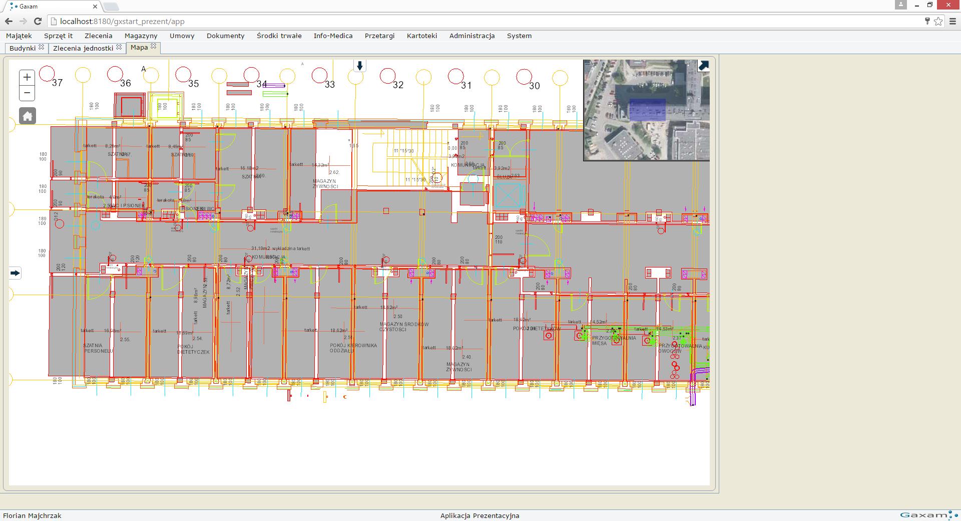 Centralny system zarządzania pracami w ramach budynków umożliwiających wsparcie pracy konserwatorów oraz monitoring kosztów. gxWork podobnie jak gxAparatura posiada rozbudowany system obsługi zgłoszeń (w tym obsługa zleceń, przydzielanie i rozliczanie zadań), który w połączeniu z rejestrem urządzeń niemedycznych oraz sprzętu i budynków dają kompletną informację o prowadzonych pracach. Cechą specyficzną rozwiązanie jest możliwość poruszania się po planie szpitala z dostępem do informacji ilościowych (powierzchnia ścian, okien, ilość gniazdek etc.). Informacje te w istotny sposób pozwalają określić wymiar prac oraz planować koszty. Dodatkowo w skład systemu wchodzi funkcjonalność w zakresie ewidencji pojazdów (przebiegi, ubezpieczenia, koszty napraw etc.).