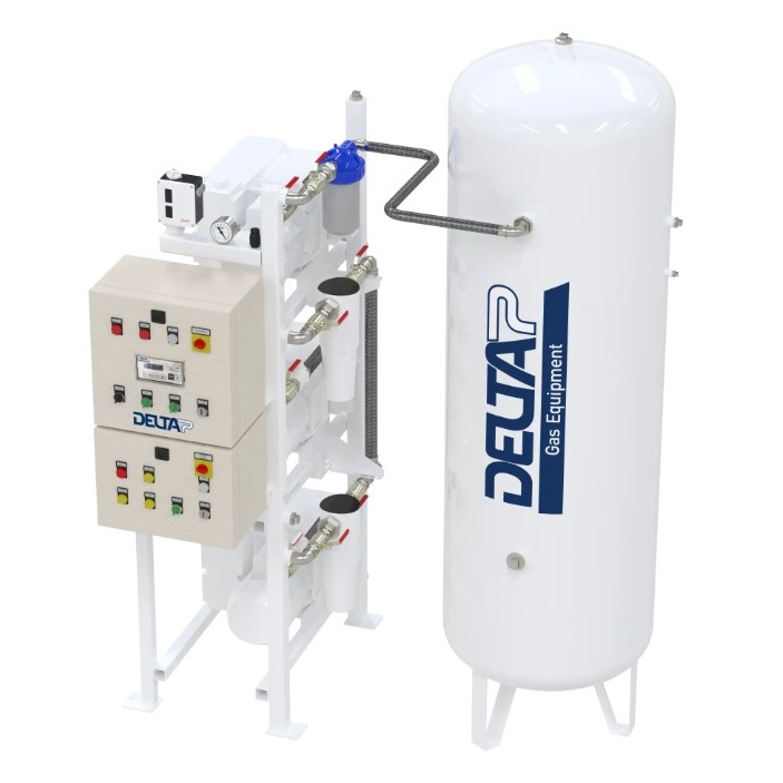 Zawiera pionowy zbiornik, system odprowadzania kondensatu i podwójne filtry bakteriobójcze (zgodnie z normą UNI EN ISO 7396-1:2007 5.7.1).