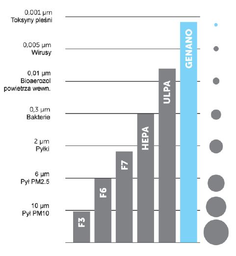 Proces dekontaminacji powietrza oparty na Technologii Genano® pozwala wychwycić z powietrza i zneutralizować wszystkie – nawet najmniejsze cząstki o wielkości do 3 nm (0,003 μm). Urządzenia Genano® oparte na tej technologii przeznaczone są do pracy ciągłej w obecności ludzi w pomieszczeniu.