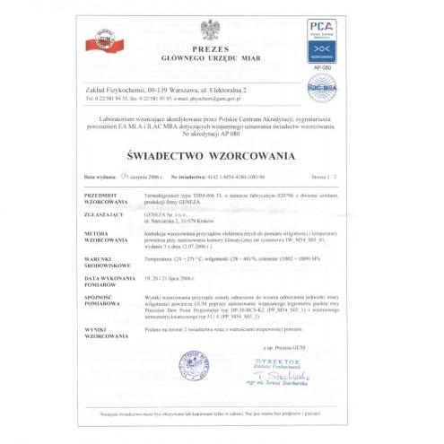 Termohigrometr mikroprocesorowy THM-406 FL jest przeznaczony do pomiaru i/lub programowej rejestracji temperatury i wilgotności względnej w różnych procesach technologicznych, badaniach naukowych, klimatyzowanych pomieszczeniach, magazynach i chłodniach składowych. Rejestrator został ponadto wyposa¿ony w po dwa alarmy wizualne przekroczenia zadanego przez użytkownika progu temperatury oraz wilgotności minimalnej lub maksymalnej. Rozbudowana klawiatura umożliwia użytkownikowi łatwe wykorzystanie wszystkich funkcji przyrządu jak również rozpoczęcie/zakończenie rejestracji przy pomocy jednego klawisza klawiatury.