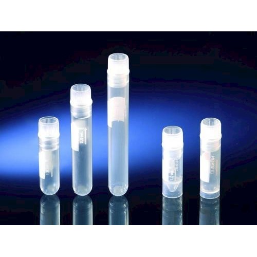 Do przenoszenia w zamrożeniu i przechowywania materiałów biologicznych. Gwint wewnętrzny z uszczelką silikonową zapewniają najlepsze z możliwych uszczelnienie. Dostępne z czterema różnymi kształtami dna. Z dnem okrągłym lub stożkowym, z podstawą (wolnostojące) lub bez niej (wymagające statywu). Spełniają wymagania IATA dla transportu próbek diagnostycznych i USP klasy VI. Pakowane w dające się zamykać szczelne torebki z wydrukowanym numerem katalogowym i serii. Apirogenne, nietoksyczne, sterylne (SAL 106) ze znakiem CE. Do użytku w ciekłym azocie muszą zostać uszczelnione w tulejach Nunc CryoFlex (patrz akcesoria). Certyfikowany brak DNaz i RNaz. Materiał probówek i nakrętek PP.