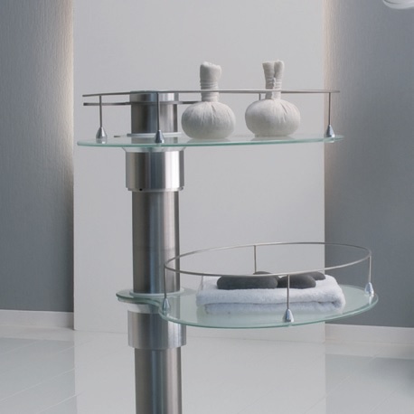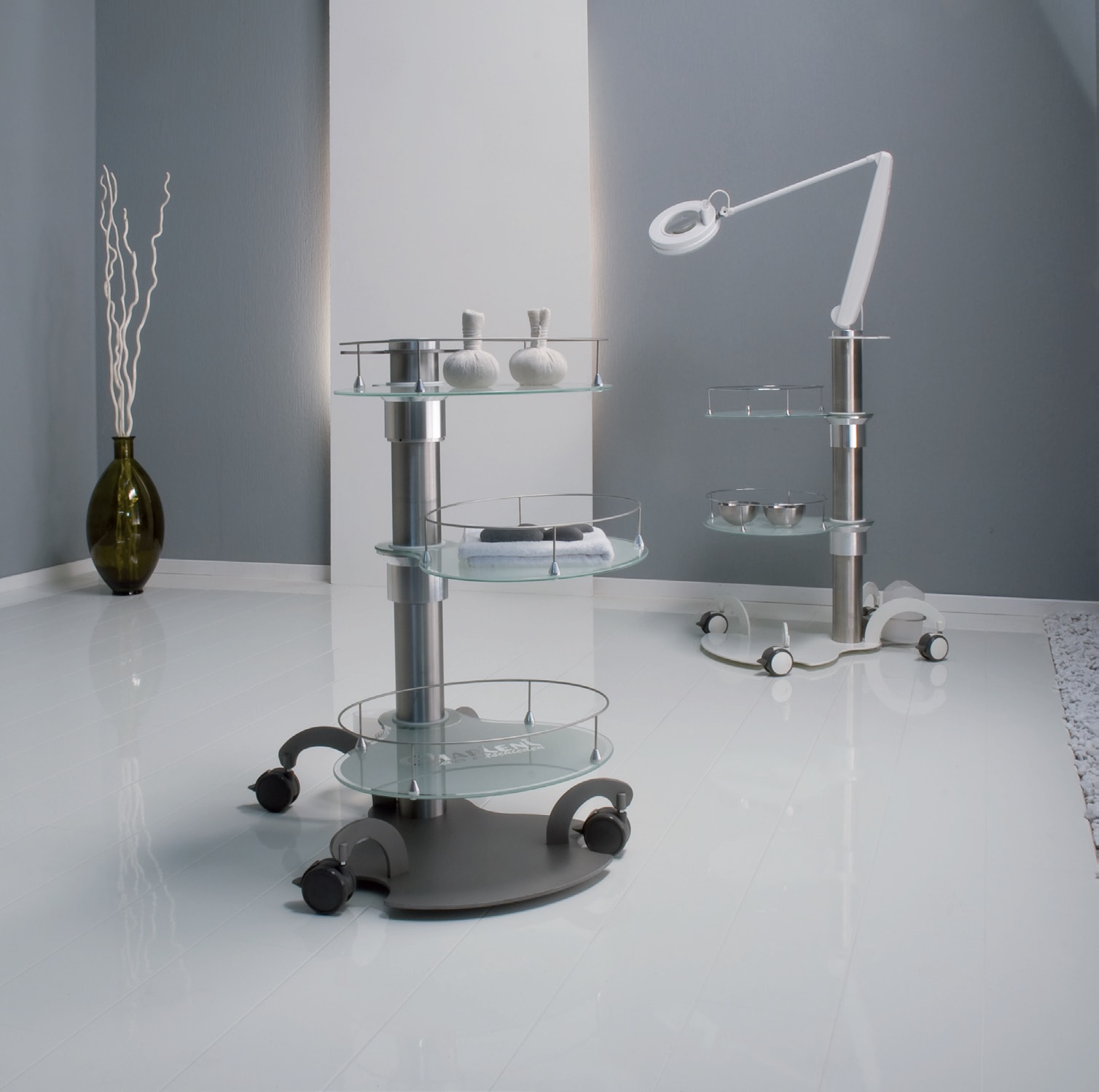 Na wózku Gharieni GlaStyle można przechowywać na dekoracyjnych taflach szklanych z obramowaniem w stałej gotowości niezbędne przybory, sprzęty i preparaty kosmetyczne.