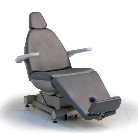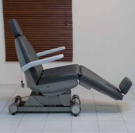 Nowa generacja tych foteli oferuje maksymalny komfort zarówno dla pacjenta jak i dla lekarza czy pielęgniarki. Funkcja pamięci gąbki Memory Schaum pozwala na uformowanie tapicerki w sposób odpowiadający indywidualnemu zaporzebowaniu. 5 silników elektrycznych wspomaga regulację wysokości w zakresie od 54 cm do 83 cm, regulację oparcie, podnóżka, pozycji wypoczynkowej oraz drewnianego podpory pod nogi. Funkcja pamięci położeniależanki pozwala na zaprogramowanie nawet do 8 pozycji. Fotel można w bardzo łatwy i szybki sposób przy pomocy silników elektrycznych oraz mechanicznie przestawić do pozycji “szok”. Konstrukcja fotela jest bardzo stabilna i wykonana jest ze stali pokrytej warstwą lakieru w kolorze tytanowym (inne kolory za dopłątą) z elementami wykonanymi ze stali nierdzewnej. Dzięki dźwigni w podstawie można w łatwy sposób wysunąć kółka i przemieścić fotel w dowolne miejsce. Ze względów higienicznych tapicerka wykonana jest z jednego elementu i nie posiada żadnych szwów. Pozwala to na łatwą dezynfekcję i mycie fotela. Szczególnie ważna jest funkcja przestawienia fotela w pozycję wypoczynkową w dolnej pozycji, ponieważ pozwala to na maksymalne obniżenie nawet do 47cm. Stanowi to duże ułatwienie wchodzenia na fotel osobom mniej sprawnym. Funkcja przestawiania drewnianej podpory pod nogi pozwala na dopasowanie długości do każdego pacjenta. Tapicerka zagłówka i pleców posiada wbudowany magnes, który pozwala na zamontowanie dodatkowej podpory pod kark na każdej wysokości. Fotel w standardzie wyposażony jest w airbag czyli pompowaną powietrzem poduszkę podpierającą kręgosłup na wysokości miednicy. W zależności od zastosowanie fotela istnieje możliwość wyboru różnych wariantów