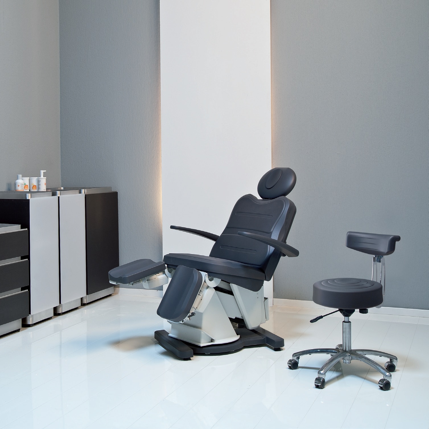 Szczególnie niska pozycja wsiadania na fotel (49 cm) umożliwia wykonywanie zabiegów nawet u mało sprawnych klientów. Fotel po pochyleniu do pozycji wypoczynkowej obniża się jeszcze o 3 cm co daje 46cm wysokości wsiadania. Dzięki możliwości przechylenia siedziska o 25° można w najwyższym położeniu uzyskać pozycję roboczą do opracowywania stóp