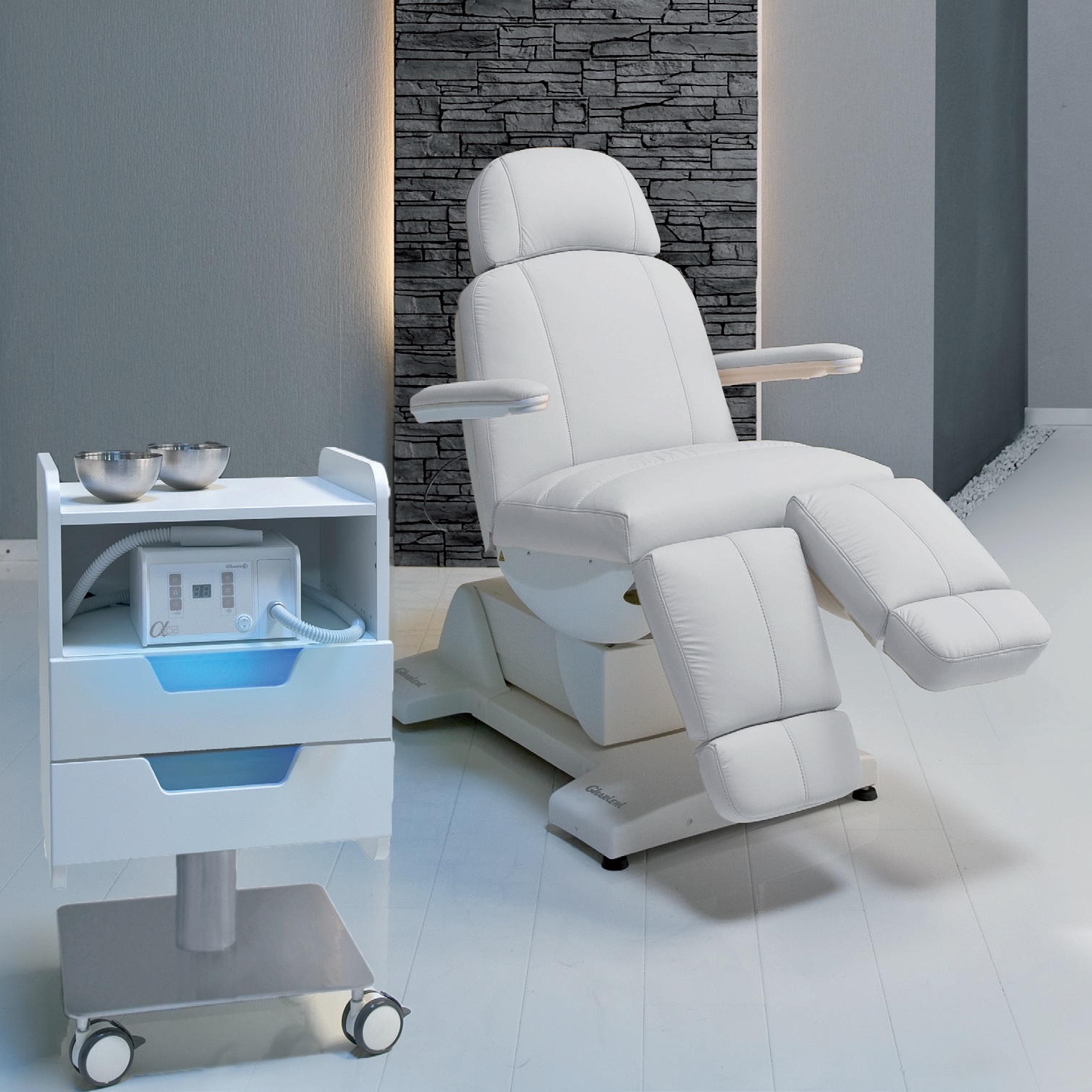 wymaganiom norm medycznych. W fotelu SPL Podo zastosowano specjalny, wielofunkcyjny zagłówek, zapewniający doskonały komfort podczas zabiegu umożliwiaja także swobodne obserwowanie samego leczenia przez pacjenta. Fotel dostępny jest w dwóch wersjach: w pełni elektrycznej z pięcioma silnikami oraz trzema silnikami, w której część nożna regulowana jest za pomocą siłowników pneumatycznych. Fotel SPL Podo 5 dostępny jest w wersji z pięciom silnikami.