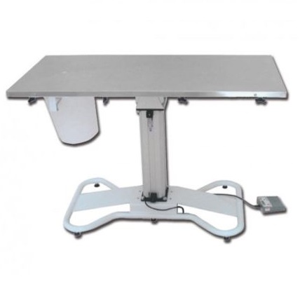 Weterynaryjny stół operacyjny z podnośnikiem elektrycznym (82/102 cm). Emaliowane stalowe ramy oraz AISI 304 szczycie ze stali nierdzewnej z otworem i uchwytem do wiadra pod spodem.