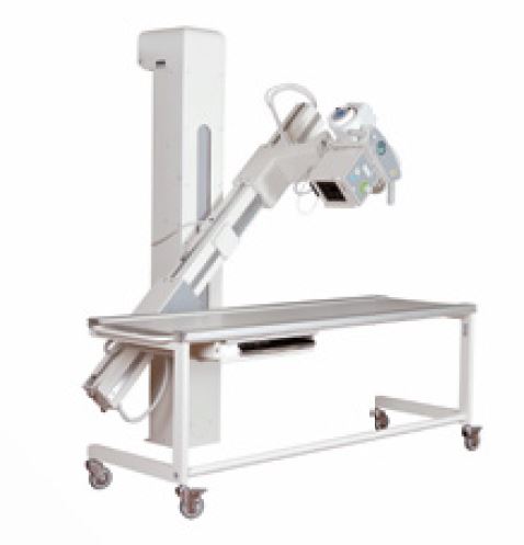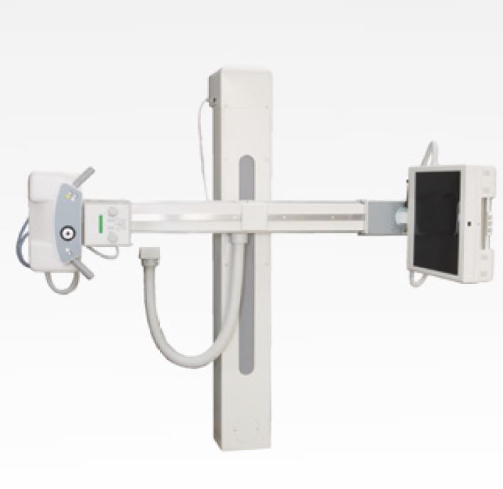 Uniwersalny zestaw RTG do bezpośredniej radiografi i cyfrowej DR, składający się z kolumny oraz unoszonego i obracanego ramienia U. Na ramieniu po przeciwnych stronach znajdują się: kołpak z lampą rtg i pochylany panel bucky z detektorem DR.