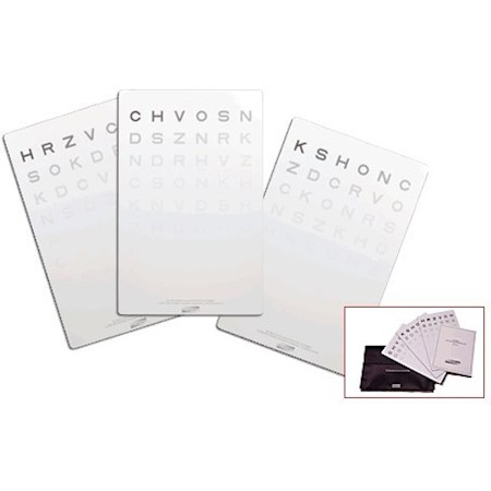 Nowe tablice literowe wrażliwości na kontrast, zastępujące nieprodukowane już tablice Pelli-Robson. W komplecie tablice 3 szt , instrukcja i karta badania.Wszystkie trzy tablice wykorzystujemy w sytuacji, gdy musimy zbadać wrażliwość na kontrast jednoocznie i obuocznie. W razie badania wyłącznie obuocznego można korzystać z pojedynczej tablicy .