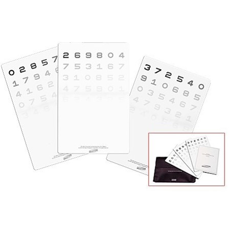 Nowe tablice literowe wrażliwości na kontrast, zastępujące nieprodukowane już tablice Pelli-Robson. W komplecie tablice 3 szt , instrukcja i karta badania.Wszystkie trzy tablice wykorzystujemy w sytuacji, gdy musimy zbadać wrażliwość na kontrast jednoocznie i obuocznie. W razie badania wyłącznie obuocznego można korzystać z pojedynczej tablicy .