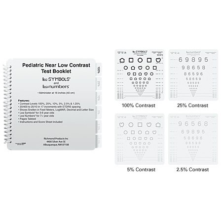 Książeczka obniżonego kontrastu (100%), 25%, 10%, 5%, 2,5% i 1,25% proporcjonalnie rozmieszczonych optotypów (LogMAR) w zakresie od 20/400 do 20/16 przy użyciu miar Michelsona. Po jednej stronie każdej strony znajdują się Symbole LEA dla dzieci od 3 do 5 lat. Odwrotna strona pokazuje cyfry LEA do testowania dzieci od 5 do 8 lat. Testy te zapewniają skuteczny sposób wykrywania lub śledzenia patologii oczu, w tym jaskry, ARMD, retinopatii cukrzycowej, zaćmy i rogówki. Pomiary utraty ostrości o niskim kontraście mogą być wykorzystane do wykazania postępu w leczeniu chorób i pomóc rodzicom dzieci zrozumieć potrzebę dalszego wsparcia.