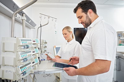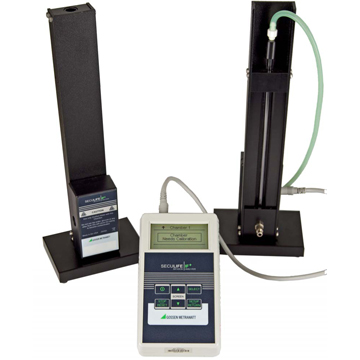 The unit can test two volumetric pumps for output flow rate simultaneously using two volumetric chambers.
