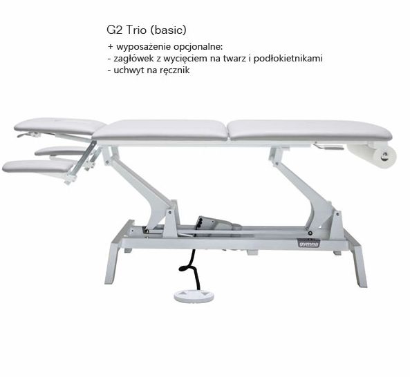 Wysokiej klasy, trzyczęściowy stół z regulowanym zagłówkiem w zakresie od -73o do +30o oraz regulowanym podnóżkiem w zakresie od 0odo +85o., o wymiarach 205cm x 67cm, na 4 antypoślizgowych stopach. Regulacja wysokości leżyska w zakresie od 47cm do 100cm. G2 Trio może być doposażony w nagłówek z podłokietnikiem dla optymalnej pozycji leżącej pacjenta. Możliwość zamontawania uchwytu na ręcznik od strony podnóżka. Dzięki prześwitowi ramy (15 cm) istnieje możliwość podjechania do stołu podnośnikiem dla pacjenta.