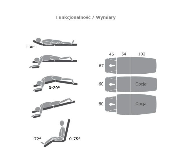 - stół trztczęściowy z regulowaną częścią zagłówka (-72o do +30o), częścią środkową (0o do +20o) i podnóżka (0o do +75o),