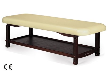 Oszczędna w formie, funkcjonalna, wygodna, praktyczna półka w wyposażeniu, gruba, miękka pianka i zaokrąglone rogi zdobią blat, ciemne drewno w kolorze buk barwiony, szeroka gama kolorystyczna. Dane techniczne: długość 194 cm, szerokość 70 cm, dopuszczalne obciążenie 200 kg, wysokość (regulowana skokowo) 58 - 83 cm.