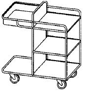 Wózek wielopoziomowy EW 390 z otwartą częścią na czystą bieliznę. Zamiast obręczy na worek - pojemnik na przybory (600 × 400 × 100 mm). Szer./gł./wys. = 955 × 600 × 1100 mm. Odległ. między półkami: 320 mm. Powierzchnia półki: 560 × 480 mm.