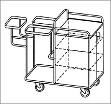 Wózek wielopoziomowy do czystej i brudnej bielizny, zamknięty, szafka z 2 półkami (3 komory), drzwiczki otwierane do kąta 270°, 3 obręcze HR 2000 do zamocowania worków (obręcz wyposażona jest w kołnierz gumowy zawijany do góry, dzięki czemu worek nie zsuwa się z obręczy, aby zdjąć worek ze zbieracza wystarczy pociągnąć brzeg worka do dołu), pokrywy na zawiasie, otwierane ręcznie, dostępne kolory pokryw: biały, żółty, czerwony, zielony, niebieski, brązowy, szary, czarny, konstrukcja wózka wykonana z rurki stali nierdzewnej o średnicy 22 mm, solidnie spawana, pozbawiona śrub i ostrych krawędzi, kolor półek: jasnoszary, krawędzie zabezpieczone tworzywem, 4 kółka obrotowe o średnicy 125 mm, wymiary: 1335 x 600 x 1090 mm (szer./ gł./ wys.)