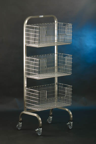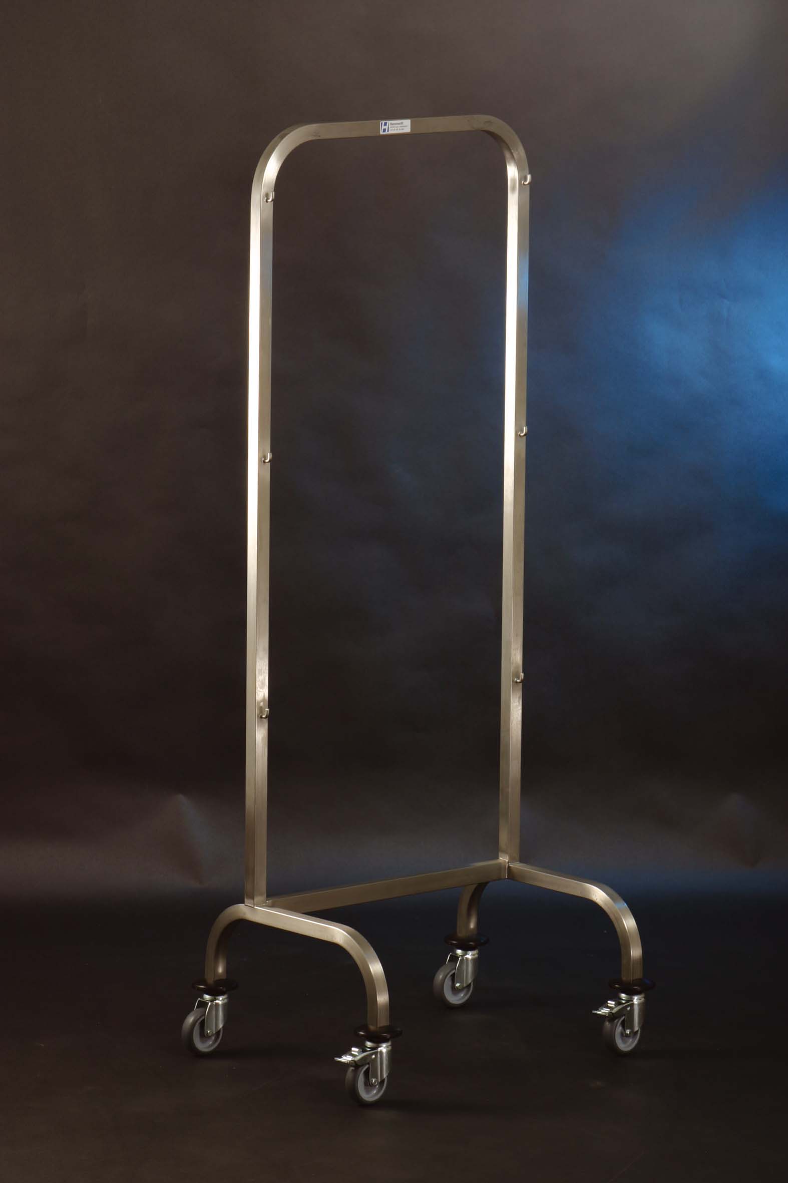 Wózek hakowy jednostronny STAL NIERDZEWNA, material 1.4301 konstrukcja z rurki stalowej o przekroju kwadratu (25 x 25 mm) z przyspawanymi hakami do zawieszenia 3 koszy, dopuszczalne obciążenie haków: 60kg na hak. 4 odporne na ścieranie, korozję, antystatyczne kółka obrotowe (2 z blokadą) o średnicy 75 mm ze zderzakami w formie krążka. Odległość między hakami: 400 mm. Wymiary: 610 x 470 x 1450 mm (szer./ gł. / wys.)
