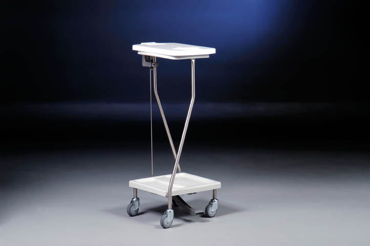 Pojedynczy zbieracz odpadów, z opatentowaną obręczą HR 2000 do zamocowania 1 worka (obręcz wyposażona jest w kołnierz gumowy zawijany do góry, dzięki czemu worek nie zsuwa się z obręczy, aby zdjąć worek ze zbieracza wystarczy pociągnąć brzeg worka do dołu), z wytrzymałą pokrywą wykonaną z ABS, otwieraną za pomocą mechanizmu pedału, dostępne kolory pokryw: biały, żółty, czerwony, zielony, niebieski, brązowy, szary, czarny, zbieracz wyposażony w wyjmowaną dolną półkę z ABS w kolorze jasnoszarym zabezpieczającą podłogi przed zabrudzeniem, konstrukcja zbieracza wykonana ze stali nierdzewnej, solidnie spawana, pozbawiona śrub i ostrych krawędzi, 4 kółka obrotowe o średnicy 75 mm, dostępne również inne kółka, wymiary: 410 x 485 x 950 mm (szer./gł./wys.)