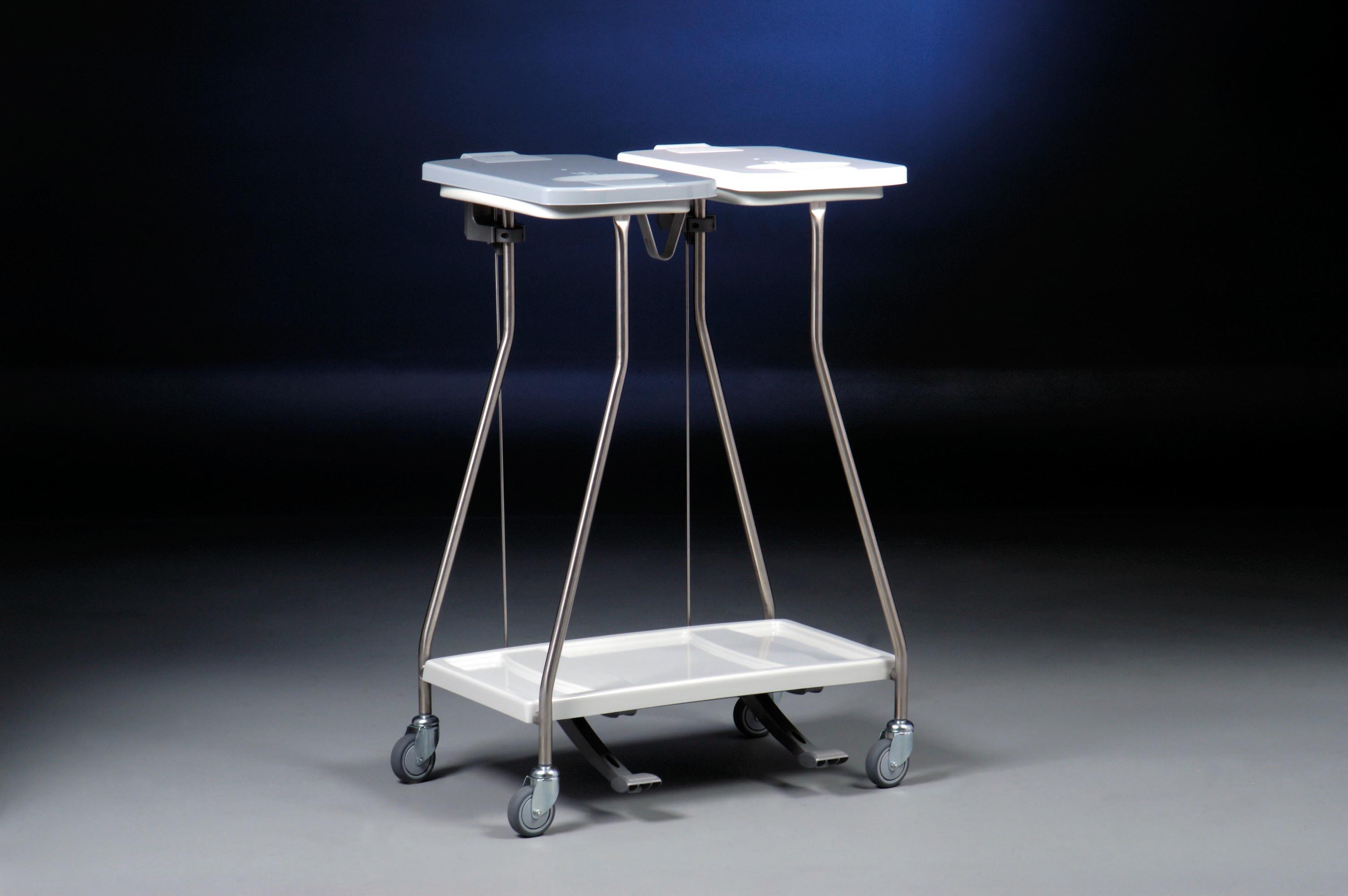 Podwójny zbieracz odpadów, z 2 opatentowanymi obręczami HR 2000 do zamocowania worków (obręcz wyposażona jest w kołnierz gumowy zawijany do góry, dzięki czemu worek nie zsuwa się z obręczy, aby zdjąć worek ze zbieracza wystarczy pociągnąć brzeg worka do dołu), z wytrzymałymi pokrywami wykonanymi z ABS, otwieranymi za pomocą mechanizmu pedału, z mechanizmem tłumienia hałasu przy zamykaniu pokrywy (mechanizm spowalniający opadanie pokrywy), dostępne kolory pokryw: biały, żółty, czerwony, zielony, niebieski, brązowy, szary, czarny, zbieracz wyposażony w wyjmowaną dolną półkę z ABS w kolorze jasnoszarym zabezpieczającą podłogi przed zabrudzeniem, konstrukcja zbieracza wykonana ze stali nierdzewnej, solidnie spawana, pozbawiona śrub i ostrych krawędzi, 4 kółka obrotowe o średnicy 75 mm, dostępne również inne kółka, wymiary: 660 x 485 x 950 mm (szer./gł./wys.)