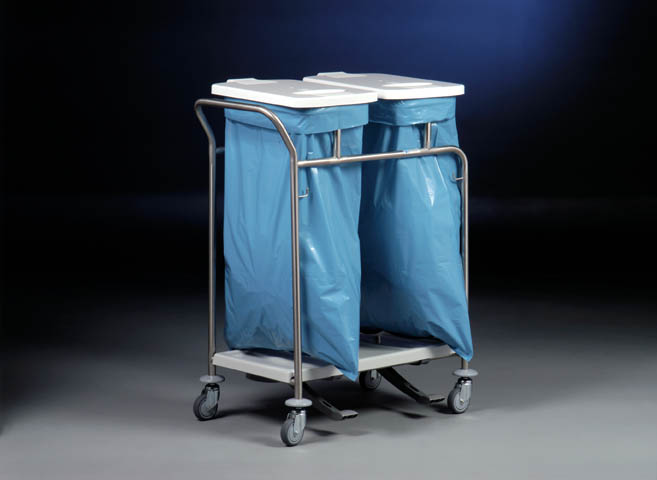Podwójny zbieracz odpadów, z 2 opatentowanymi obręczami HR 2000 do zamocowania worków (obręcz wyposażona jest w kołnierz gumowy zawijany do góry, dzięki czemu worek nie zsuwa się z obręczy, aby zdjąć worek ze zbieracza wystarczy pociągnąć brzeg worka do dołu), z wytrzymałymi pokrywami wykonanymi z ABS, otwieranymi za pomocą mechanizmu pedału, dostępne kolory pokryw: biały, żółty, czerwony, zielony, niebieski, brązowy, szary, czarny, zbieracz wyposażony w wyjmowaną dolną półkę z ABS w kolorze jasnoszarym zabezpieczającą podłogi przed zabrudzeniem, konstrukcja zbieracza wykonana ze stali nierdzewnej, solidnie spawana, pozbawiona śrub i ostrych krawędzi, dodatkowy haczyk stalowy, 4 kółka obrotowe o średnicy 75 mm ze zderzakami w formie krążków, dostępne również inne kółka, wymiary: 750 x 485 x 950 mm (szer./gł./wys.)