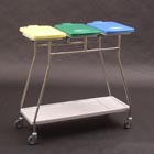 Potrójny zbieracz odpadów, z 3 opatentowanymi obręczami HR 2000 do zamocowania worków (obręcz wyposażona jest w kołnierz gumowy zawijany do góry, dzięki czemu worek nie zsuwa się z obręczy, aby zdjąć worek ze zbieracza wystarczy pociągnąć brzeg worka do dołu), z wytrzymałymi pokrywami wykonanymi z ABS, na zawiasie, otwieranymi ręcznie, dostępne kolory pokryw: biały, żółty, czerwony, zielony, niebieski, brązowy, szary, czarny, zbieracz wyposażony w wyjmowaną dolną półkę z ABS w kolorze jasnoszarym zabezpieczającą podłogi przed zabrudzeniem, konstrukcja zbieracza wykonana ze stali nierdzewnej, solidnie spawana, pozbawiona śrub i ostrych krawędzi, 4 kółka obrotowe o średnicy 75 mm, dostępne również inne kółka, wymiary: 1000 x 475 x 950 mm (szer./gł./wys.)