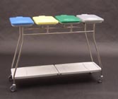4-częściowy zbieracz odpadów, z 4 opatentowanymi obręczami HR 2000 do zamocowania worków (obręcz wyposażona jest w kołnierz gumowy zawijany do góry, dzięki czemu worek nie zsuwa się z obręczy, aby zdjąć worek ze zbieracza wystarczy pociągnąć brzeg worka do dołu), z wytrzymałymi pokrywami wykonanymi z ABS, na zawiasie, otwieranymi ręcznie, dostępne kolory pokryw: biały, żółty, czerwony, zielony, niebieski, brązowy, szary, czarny, zbieracz wyposażony w wyjmowaną dolną półkę z ABS w kolorze jasnoszarym zabezpieczającą podłogi przed zabrudzeniem, konstrukcja zbieracza wykonana ze stali nierdzewnej, solidnie spawana, pozbawiona śrub i ostrych krawędzi, 4 kółka obrotowe o średnicy 75 mm, dostępne również inne kółka, wymiary: 1330 x 475 x 950 mm (szer./gł./wys.)