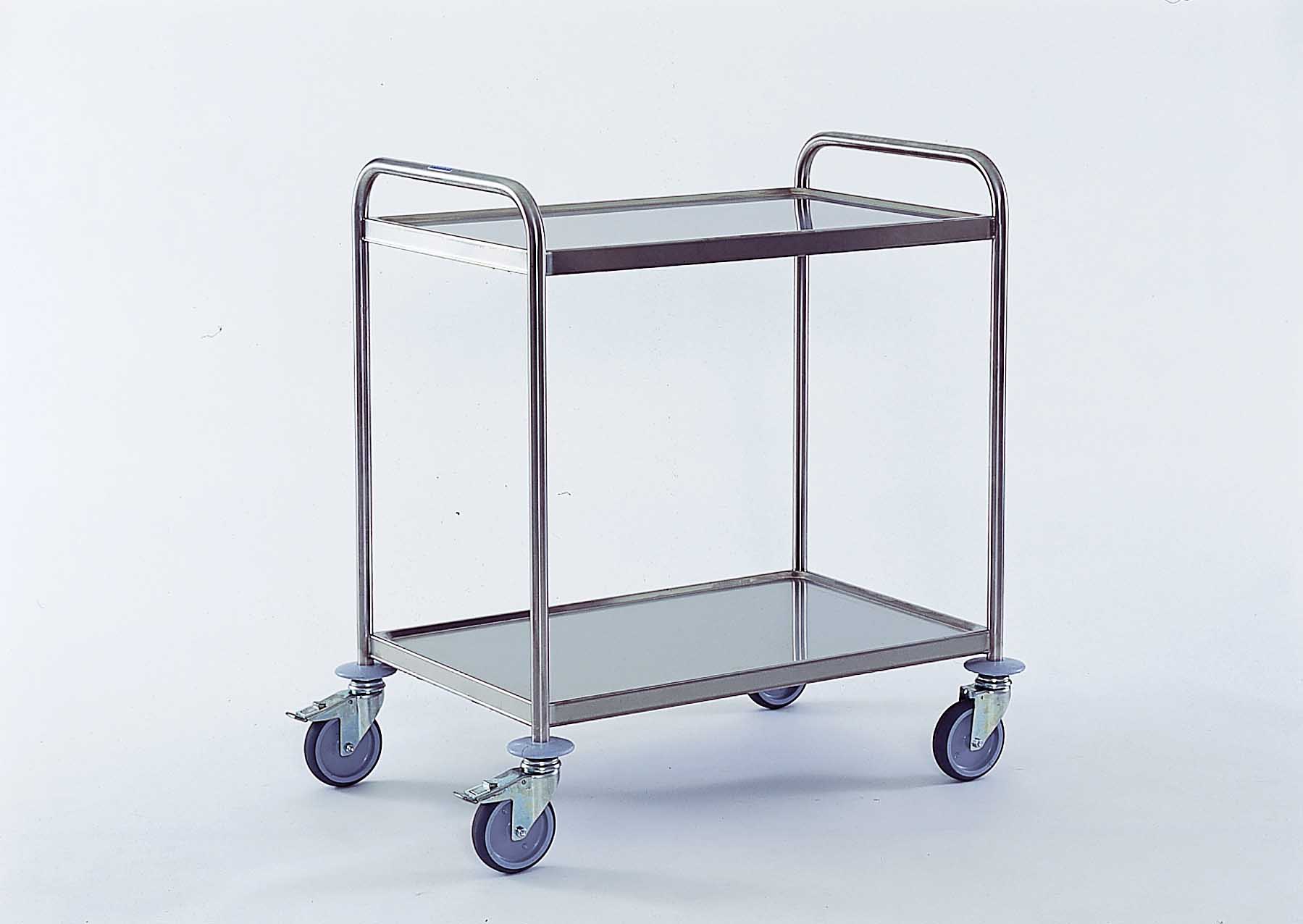 Wózek wielozadaniowy, STAL NIERDZEWNA, solidnie spawana, pozbawiona śrub i ostrych krawędzi, 2 półki o wymiarach: 800 x 500 mm, wys. dolnej półki: 230 mm, wys. górnej półki: 850 mm, odległ. między półkami: 585 mm, dopuszczalne obciążenie półki: 40 kg, 4 kółka obrotowe (2 z blokadą) o średnicy 125 mm, oprawa kółek: poliamid, termoplastyczne ogumienie, 4 zderzaki w formie krążka, dopuszczalne obciążenie wózka: 120 kg, wymiary: 900 x 600 x 950 mm (szer. / gł. / wys.)
