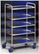 Wózek wielozadaniowy, STAL NIERDZEWNA, solidnie spawana, pozbawiona śrub i ostrych krawędzi, 5 półek o wymiarach: 800 x 500 mm, wys. dolnej półki: 230 mm, wys. górnej półki: 1160 mm, odległ. między półkami: 205 mm, dopuszczalne obciążenie półki: 40 kg, 4 kółka obrotowe (2 z blokadą) o średnicy 125 mm, oprawa kółek: poliamid, termoplastyczne ogumienie, 4 zderzaki w formie krążka, dopuszczalne obciążenie wózka: 120 kg, wymiary: 900 x 600 x 1290 mm (szer. / gł. / wys.)