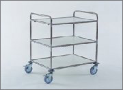 Wózek wielozadaniowy, STAL NIERDZEWNA, solidnie spawana, pozbawiona śrub i ostrych krawędzi, 3 wkładane półki z płyty laminowanej w kolorze jasnoszarym (na zamówienie również w innych kolorach), wymiary półek: 600 x 400 mm odpowiadają wymiarom modułów, wys. dolnej półki: 200 mm, wys. górnej półki: 845 mm, odległ. między półkami: 300 mm, dopuszczalne obciążenie półki: 80 kg, 4 kółka obrotowe (2 z blokadą) o średnicy 125 mm, z szarym ogumieniem, oprawa kółek: ocynkowana, pokryta warstwą chromu, 4 zderzaki w formie krążka, dopuszczalne obciążenie wózka: 200 kg, wymiary: 730 x 540 x 965 mm (szer. / gł. / wys.)