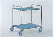 Wózek wielozadaniowy, STAL NIERDZEWNA, solidnie spawana, pozbawiona śrub i ostrych krawędzi, 2 wkładane półki z płyty laminowanej w kolorze jasnoszarym (na zamówienie również w innych kolorach), wymiary półek: 800 x 600 mm, wys. dolnej półki: 200 mm, wys. górnej półki: 845 mm, odległ. między półkami: 610 mm, dopuszczalne obciążenie półki: 80 kg, 4 kółka obrotowe (2 z blokadą) o średnicy 125 mm, z szarym ogumieniem, oprawa kółek: ocynkowana, pokryta warstwą chromu, 4 zderzaki w formie krążka, dopuszczalne obciążenie wózka: 200 kg, wymiary: 940 x 730 x 965 mm (szer. / gł. / wys.)