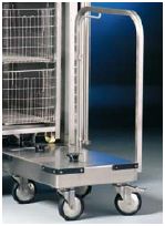 Wózek przekaźnikowy Shuttle, STAL NIERDZEWNA, materiał 1.4301, z mechanizmem do bezpiecznego przyjęcia i zatrzymania stelaża wsadowego EGSTE3E60 lub EGSTE3, mechanizm zakotwiczający do bezpiecznego połączenia wózka z transporterem RGEE2x3SH systemu Shuttle (blokada umieszczona w uchwycie), 3-stronny zderzak z tworzywa, 4 antystatyczne kółka obrotowe (2 z blokadą) o średnicy 75 mm, w oprawie stalowej, wymiary: 445 x 640 x 945 mm (szer. / gł. / wys.)